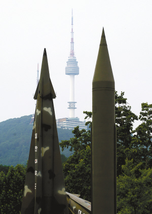 | 7月4日拍摄的在韩国首都首尔展出的朝鲜飞毛腿导弹模型(右)。 新华社/法新 |