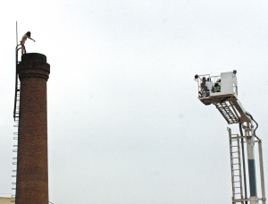 7月6日,中年女子在烟囱上与救援人员对峙。 当日中午12时,因与社区发生经济纠纷,一名中年女子裸身爬上哈尔滨市南岗区淮河路83号居民院内30米高的烟囱,以此要求给予解决。最终经过消防官兵近3个小时的奋力营救,女子被安全救下,随后被送往医院救治。 新华社记者 王松 摄