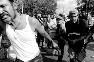 | 7月5日,在洪都拉斯首都特古西加尔巴国际机场,被罢免总统塞拉亚的支持者将一名冲突中死亡者的尸体抬走。