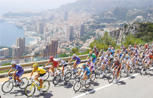 7月5日,在环法自行车赛第二赛段从摩纳哥到布里尼奥的比赛中,马·卡文迪什获得赛段冠军,瑞士选手法·坎切拉拉继续保留黄色领骑衫。图为选手们在比赛中骑行。 新华社发