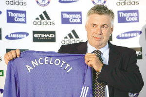 7月6日,切尔西队新主帅安切洛蒂在伦敦举行的新闻发布会上,展示印有他名字的球衣。安切洛蒂从7月1日起正式接管切尔西队。 新华社发