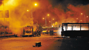 | 七月六日凌晨,在乌鲁木齐市大湾南路的跑马场地段,多辆公交车被烧毁,消防官兵赶到现场救援。