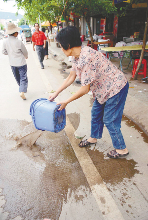 | ↑7月6日,昌江县城河南西路,一名妇女将一桶污水往街上倒。本报记者 苏建强 摄 |
