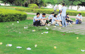 | ↑7月6日上午7时23分,在海口金盘路与金牛路交汇处的绿地上,附近一家工厂的一群员工吃完早餐,随意往草坪上丢弃早餐包装袋。 本报记者 王军 摄 |