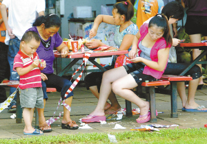 | 7月5日上午,3名妇女围坐在海口万绿园里一张小桌旁,嗑瓜子、喝饮料,肆无忌惮地在脚下制造垃圾。 本报记者 苏晓杰 摄 |