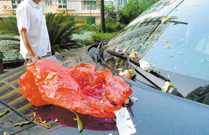 | ← 清晨,一袋垃圾从天而降,“嘭”的一声,砸在海口市成信景苑小区海景阁楼下一辆小轿车上,一位溜早的先生被吓了一跳。蛋壳、菜叶、厕纸等垃圾散落四周,“缺德人”躲在楼上任凭楼下人叫骂。