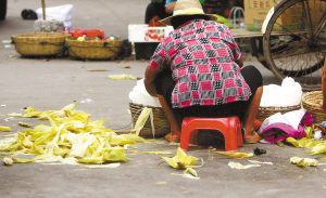 | ↑7月5日下午3时42分,陵水县城椰林镇富陵街,街边摊贩随便丢垃圾。