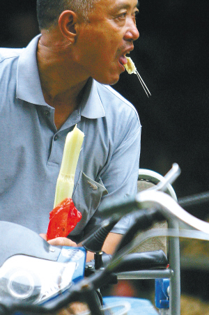 | ↑7月5日下午4时01分,陵水县城椰林镇街道上,一市民吃甘蔗随便吐甘蔗渣。