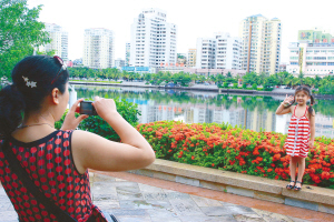 入夏后,三亚河畔鲜花盛开,河边景色秀丽迷人。7月6日,一群来自四川的游客,漫步在三亚河畔,观赏美丽的三亚河景观,并在绿树和花草边合影留念。 特约记者 孙清 摄
