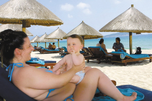 | 在亚龙湾度假的英国母子。 本报记者 张杰 摄 |