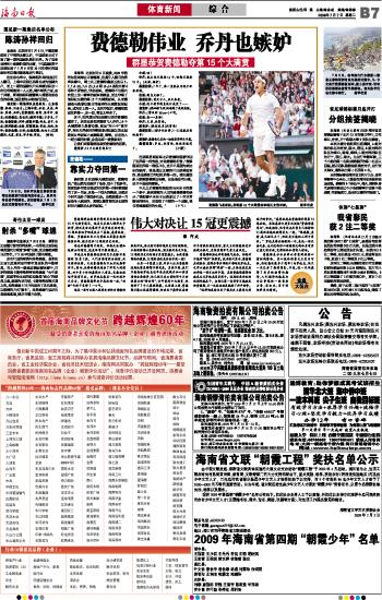 海南日报 体育新闻 015 2009-07-071 2009年07月07日 星期二