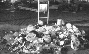 | ←7月6日晚上10时,文昌市文城镇文建路,垃圾箱内没垃圾,垃圾箱外遍地垃圾。