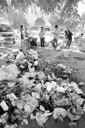 | ←7月7日下午,在三亚市凤凰镇桶井农贸市场旁,小商贩在垃圾堆旁卖甘蔗水果,此处卫生状况令人担忧。