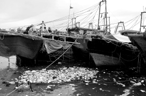↓7月6日,临高新盈镇的安全村,大量的生活垃圾被村民们随意倾倒在海岸边,漂在海里的垃圾也没人清理。 本报记者 王凯 摄