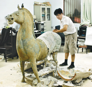 7月7日,文物修复专家对我国迄今为止发现的最大青铜马进行脱模。 这一青铜马高1.62米、长1.61米,于2008年11月在湖北省襄樊市一建设工地被发掘,出土时马的前半部分基本完好,后半部分已成碎片。文物修复专家运用一系列复杂工艺,最终将青铜马的后半部分基本修复完成。 新华社发