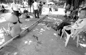 | ↑ 7月8日中午,在三亚市解放路车站旁,商贩摊位乱摆放,吐在地面上的槟榔水迹犹如血斑,随处可见,令人恶心。