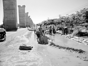 昨天上午10时,记者在南海大道药谷二期工程附近路面看到,近50名环卫工人正将路面上淤积的泥沙装到袋子里。400多米长的路段里,一共清出了600多袋泥沙。环卫部门将沙袋堆在路边希望堵住从旁边不断留下的雨水。
