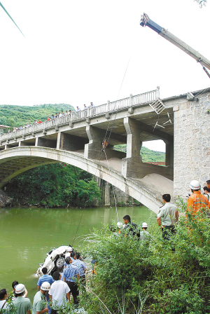 7月9日,救援人员在车祸现场打捞事故车辆。当日7时许,一辆双排座货车在经过位于贵州省黔东南苗族侗族自治州黄平县重安镇一座混凝土公路桥时,失控撞断桥体护栏坠入重安江中,事故导致车上7人死亡1人受伤。 新华社发(陈沛亮 摄)