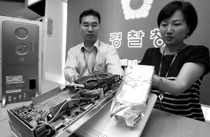 | 韩国警察厅官员在位于首尔的警察厅总部展示一台被黑客利用来攻击政府机构网站的电脑。