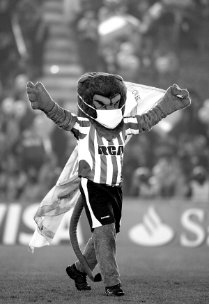7月9日,在南美解放者杯决赛第一回合较量中,阿根廷拉普拉塔大学生队主场以0比0战平巴西克鲁塞罗队。由于甲型流感正在阿根廷迅速蔓延,阿根廷拉普拉塔大学生队的足球宝贝在比赛中戴起了口罩。 新华社发
