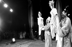 | 七月二日晚,临高县博厚镇道灶村,临高青年临剧团的演员们正在表演人偶戏。据悉,全县近四十个民营木偶剧团的生意大都红火。本报记者 王凯 摄 |