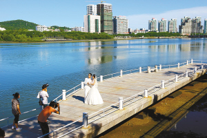 | 清凉的椰风海韵、秀丽的城市风光吸引着越来越多的新人来三亚消暑,其中不少新人还将倩影留在三亚山水间。图为近日一对新人在三亚河亲水平台拍婚纱照。特约记者 孙清 摄 |