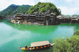 青山绿水的凤凰古城美景(7月8日摄)。 凤凰古城位于湖南省湘西土家族苗族自治州凤凰县境内,是国家历史文化名城,素有“中国最美的小城”之誉。古城紧邻沱江而建,吊脚木楼布满山坡,风景秀丽。 新华社记者 龙弘涛 摄