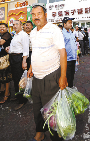 | 7月9日,在乌鲁木齐市二道桥地区,一位市民提着买到的新鲜蔬菜回家。
