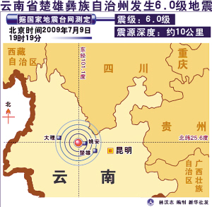 据新华社北京7月9日电(记者卫敏丽)据国家地震台网测定,7月9日19时19分,云南省楚雄彝族自治州姚安县发生6.0级地震,震源深度约10公里。此次地震震中位于姚安县官屯乡,震中距县城约16公里,大理、丽江、昆明等地震感强烈。