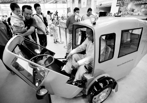 在7月10日举办的银川休闲文化节上,72岁高龄的银川市民孙兆文自己动手设计制作的一辆环保电动三轮车亮相文化节展会现场,吸引众多市民目光。 新华社记者 王鹏 摄