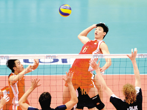 7月11日,在江苏省南京市进行的2009年世界男排联赛的一场比赛中,中国队主场以2比3负于荷兰队。图为中国队球员梁春龙(上)在扣球。 新华社发