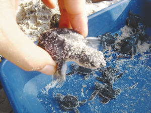 在孵化中心,我看到已经有上百只小海龟孵化了出来,它们很可爱,龟壳的颜色就像海边的沙子,这大约就是生物的拟态吧,这样可以避免刚出生的小海龟遭受天敌袭击。“放流小海龟一定要在晚上,一是为了避免它们被大的鱼类吃掉;二是如果在白天,光线太强,小海龟找不到大海的方向。”