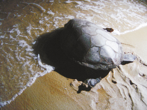 那是一只不太有经验的绿海龟。月光下,隐约可看到它爬过海滩时,四肢留下整齐清晰的爪印。它爬到一株大榕树下,挖了好几次洞,最后都因遇到坚硬的树根而作罢。这只绿海龟连着换了五个地方挖洞,耗去了大量精力,看得出来,它相当疲惫,每挪动一下身躯都要休息一两分钟,而且不停地大口喘气。一个多小时过去了,绿海龟还没挖好洞,在旁边守候着准备捡海龟蛋的两位当地渔民急了,他们趴下身子,伸出手在绿海龟身体后面悄悄帮它挖洞。但这只绿海龟似乎不领他们的情,用后肢探了探挖出的洞穴,离开了。两位渔民跺脚抱怨道:“洞挖歪了,它不肯产卵。”晚上22时30分,绿海龟无奈地回到大海。