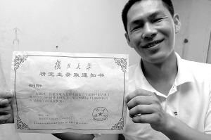 7月16日,蔡伟展示复旦大学研究生录取通知书。近日,辽宁省锦州市下岗职工、三轮车夫蔡伟被录取为复旦大学中国语言文学系中国古典文献专业2009级博士研究生。蔡伟仅有高中学历,但他对古文献研究,尤其对传世文献和出土文献研究情有独钟,在工作之余刻苦自学,终于“修成正果”,梦想成真。 新华社发