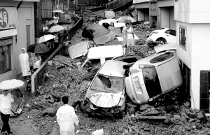 7月16日,在韩国釜山,人们查看被暴雨引发的泥石流毁坏的汽车。新华社/法新