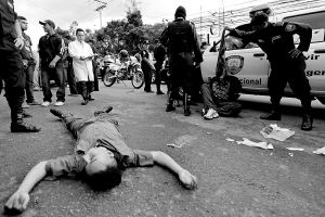 7月15日,一名男子的尸体躺在洪都拉斯首都特古西加尔巴街头。洪都拉斯临时政府发言人当天宣布,鉴于被罢免总统塞拉亚的支持者已经开始了新一轮的抗议示威活动,严重影响了该国局部地区的社会秩序和公共安全,为了保护民众的生命财产安全,临时政府决定从16日零时至早上6时在全国范围内重启宵禁措施。 新华社/路透