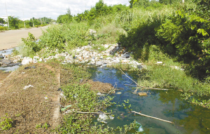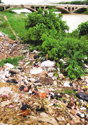 ↑7月16日,临高县临城镇二桥附近的文澜江边堆满了垃圾。 本报记者 王凯 摄