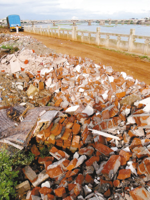 ↑7月16日下午,澄迈县金江镇金江大桥附近,一大片建筑垃圾堆放在南渡江河岸边。 本报记者 王凯 摄