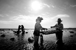 昌江黎族自治县海尾镇引导群众在近海海域低凹处种麒麟菜。据悉,麒麟菜生长期为3-4个月,一年可收获2-3次,每亩可产1500公斤,且养殖成本低,每亩麒麟菜一次性只需投入资金1万元即可。目前昌江麒麟菜养殖总面积达4200亩。图为7月16日群众在海尾镇海边种植麒麟菜。 本报记者 宋国强 特约记者 曾高文 摄