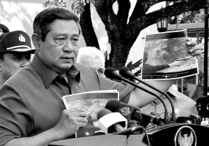 ①7月17日,印度尼西亚总统苏西洛在首都雅加达举行的新闻发布会上展示印尼情报部门提供的照片,照片显示一个恐怖团伙成员在进行射击练习。