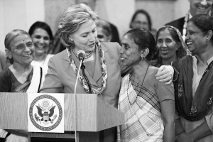 7月18日,在印度孟买,到访的美国国务卿希拉里·克林顿(前左)会见印度一个妇女自谋职业组织的成员。希拉里于17日晚到达孟买,开始对印度的数天正式访问。这是希拉里就任美国国务卿以来对印度的首次访问。 新华社/路透