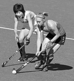 曲棍球冠军杯 中国胜英格兰 18日,在女子曲棍球冠军杯的一场比赛中,中国队以4比1战胜英格兰队。图为高丽华(左)与对手拼抢。 新华社发