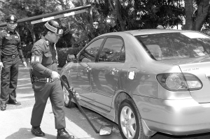 7月19日,泰国安全人员手持仪器在普吉检查过往车辆。第42届东南亚国家联盟(东盟)部长级会议和第16届东盟地区论坛分别定于20日和23日在泰国南部的普吉府开幕。泰国政府19日明显加大了安保力度。 新华社发