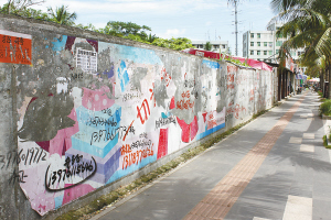 | 海口市城西学院路两边围墙上满是野广告。