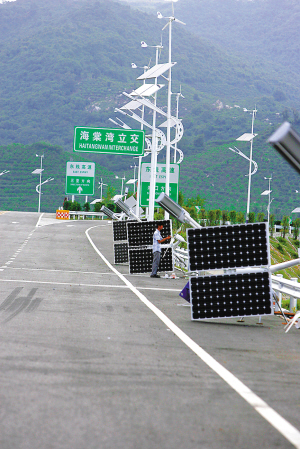 | 海棠湾景观大道即将正式通车,三亚市政工人正在忙着安装太阳能路灯。