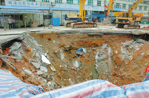7月19日早上8时左右,位于宝安西乡的深圳地铁一号线续建工程7标宝体站至坪洲站区间暗挖段地表下沉,造成施工单位活动板房下陷,两名工人躲避不及坠落其中,其中一名工人获救受伤入院,另一名工人失踪仍未找到。 新华社发