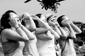 | 有幸被日全食光顾的地方,旅游收入会有持续而惊人的增长。图为 7月22日,5名年轻的外国游客在浙江安吉天荒坪天文观测点观看日全食。