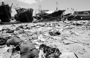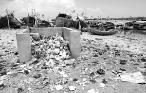 | ←7月22日,新盈港岸边,尽管有一个垃圾池,沙滩上还是垃圾遍地。 |