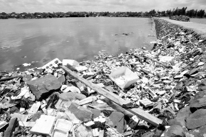 | →7月22日,新盈港岸边,随处可见的垃圾已将海岸严严实实地“盖”住了。 |