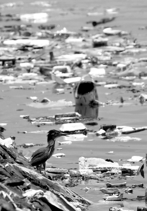 | ↑7月22日,一只海鸟停留在新盈港防波堤上,周围的海面上漂浮着大量垃圾。 |